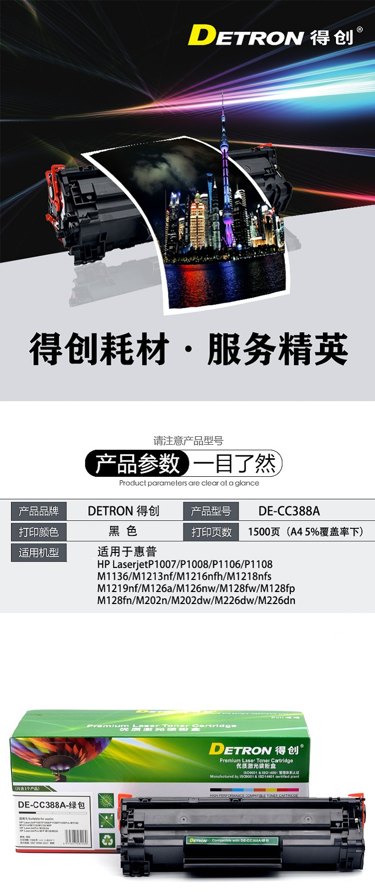 得创 绿包硒鼓适用惠普hp1108/p1106/1007/1008/m1136/1216/1213/226dw/m226dn打印机 DE-CC388A BK