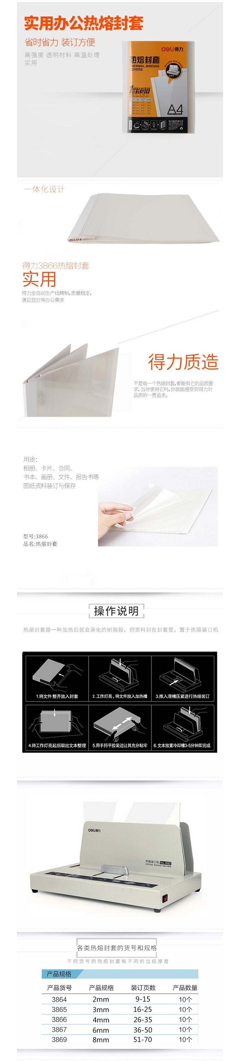商品名称: 得力(deli) A4热熔封套 白色 (3866 4mm)