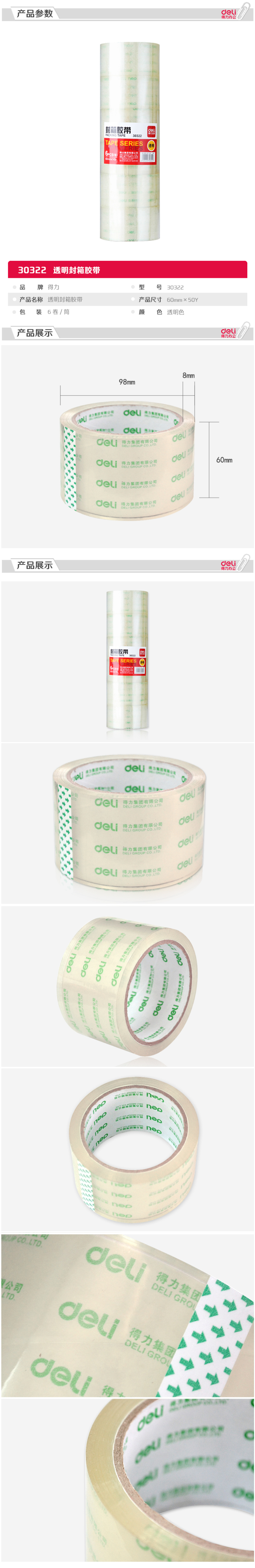 商品名称: 得力(deli) 30322 透明封箱胶带60mm*50y*50um*1卷