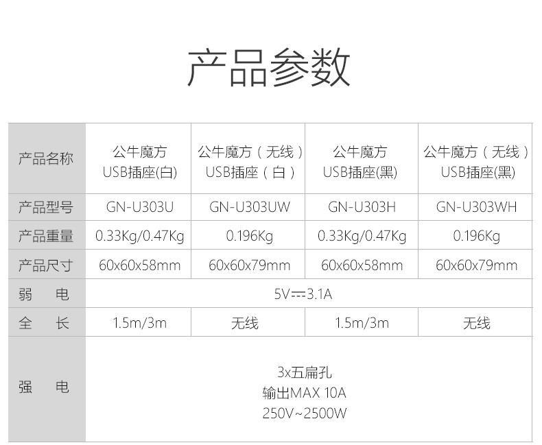 商品名称: 公牛(BULL) GN-U303N 迷你USB插座3USB口+3插孔1.5m白色