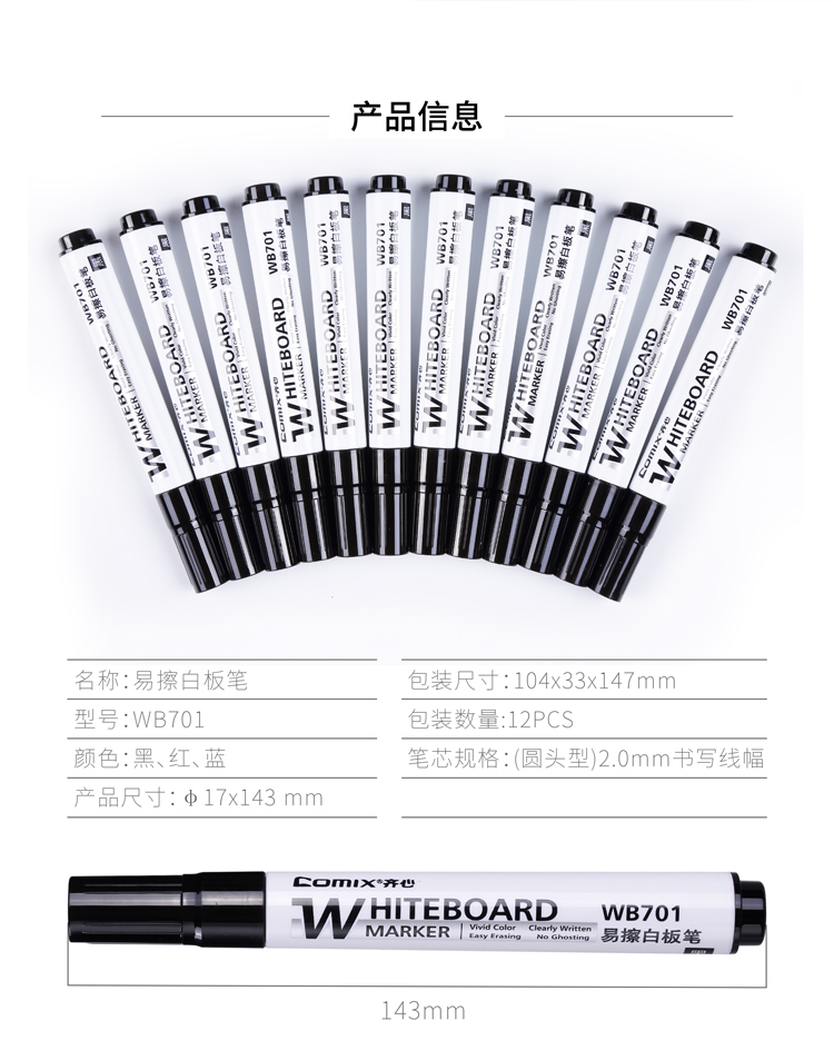 商品名称: 齐心(COMIX) WB701 可擦白板笔 2.0mm 黑色12支装(计价单位:盒)